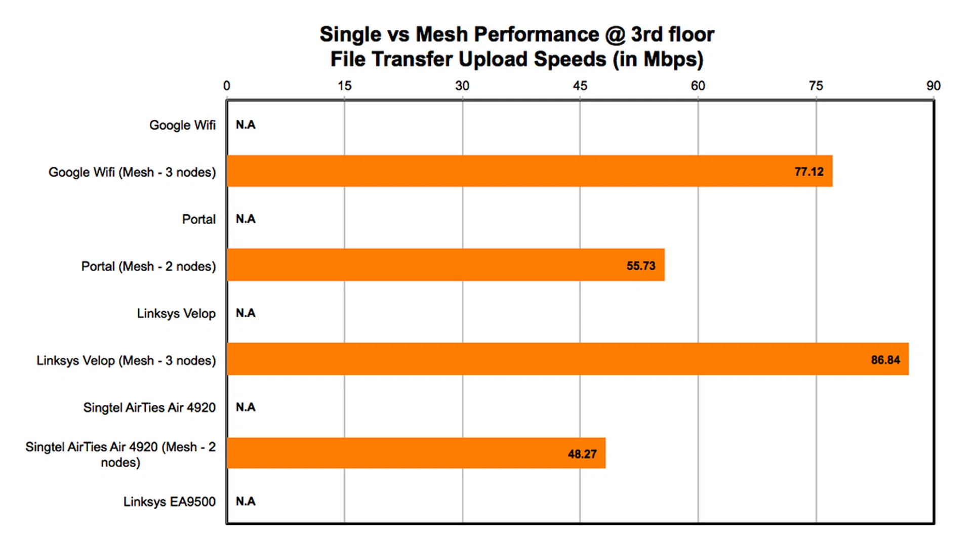 With three Google Wifi nodes in place, we were able to expand Wi-Fi coverage to three floors. The Google Wifi’s performance here was a bit of a mixed bag. Amongst all the mesh systems, it recorded the lowest download speeds, but its upload speeds were quite decent. If anything, we would say that its performance at this range is more consistent than its rivals as it managed about 70-ish Mbps overall. Only the Linksys Velop was more consistent. In the real world, we found that these speeds were sufficient to stream high-res 4K videos from YouTube. In other words, it should be good enough for most web browsing and video streaming applications.