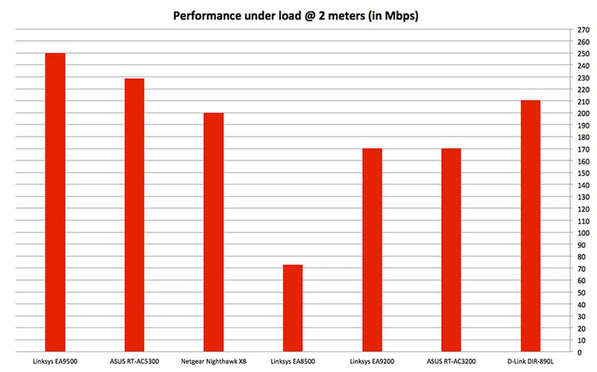 In our performance load test, where we downloaded data simultaneously using two notebooks from our host computer, the EA9500 router managed brilliantly thanks to its tri-band capability. By allocating each device its own 5GHz band, the EA9500 managed to maintain very high transfer speeds of nearly 250Mbps. From this graph, we can also see that tri-band routers have the edge in this test as they were the only routers to consistently manage above 160Mbps. For dual-band routers who have to half their bandwidth, they would typically only record speeds of around 70 - 80Mbps in this test, as both client devices were logged onto the same band.