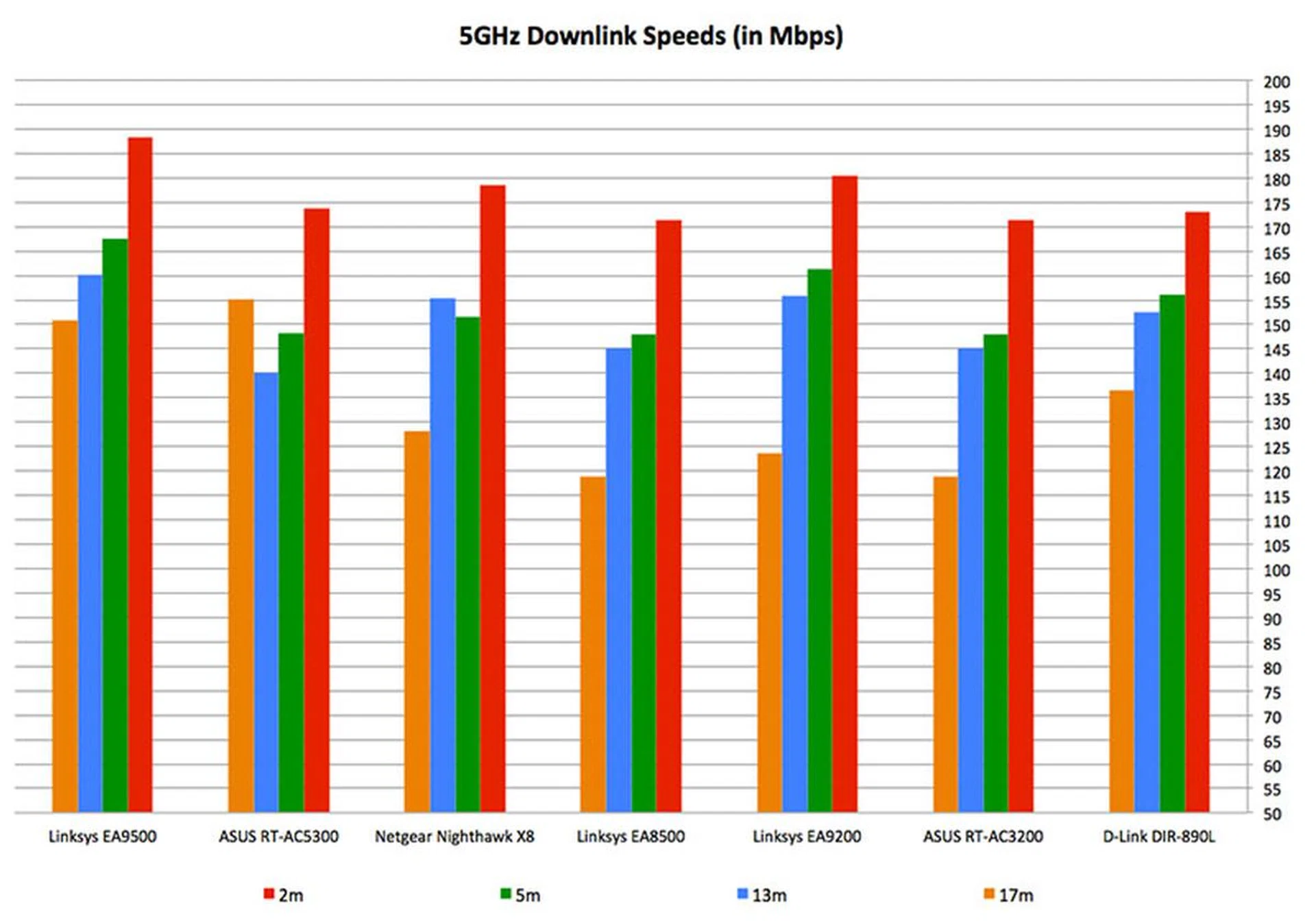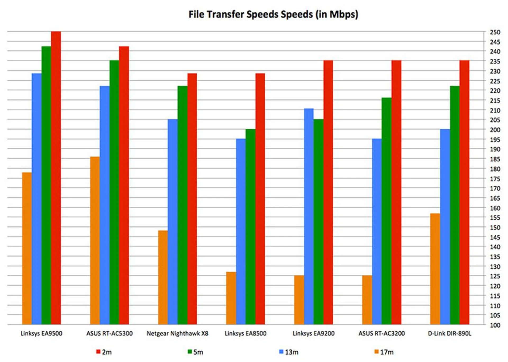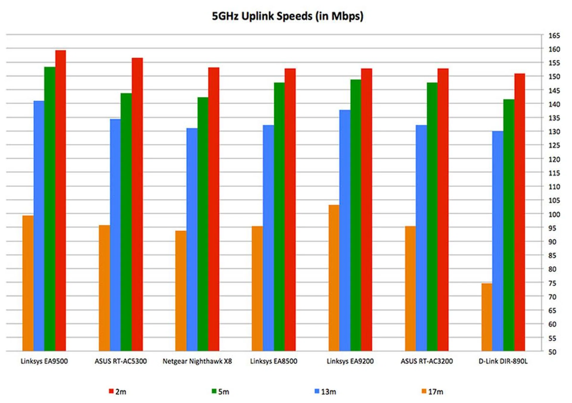 We had high hopes for Linksys’ new flagship router and the EA9500 did not disappoint. Uplink and downlink numbers on the LAN Speed Test benchmark were amongst the highest we have ever recorded, and it even maintained its performance pretty well at our farther test ranges. Overall, we consider it to be marginally quicker than the other two competing AC-5300 routers that we have tested on this test - the ASUS RT-AC5300 and Netgear Nighthawk X8.