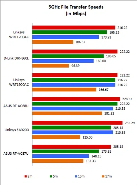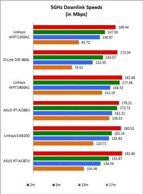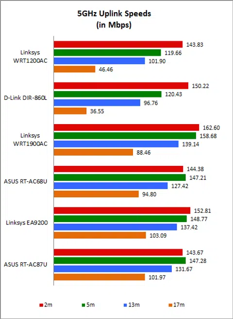 As we had predicted, close range uplink performance of the WRT1200AC router at 2 meters was competitive and comparable to faster routers such as the ASUS RT-AC68U and RT-AC87U. Downlink performance at 2 meters was good too, but a little underwhelming, as it trailed by roughly 5%. As we moved further out, the performance of the WRT1200AC router started dipping much more drastically than other faster class routers. However, it maintained a small lead over the comparable D-Link DIR-860L router. At the farther ranges of 13 and 17 meters, the WRT1200AC router held a good lead of about 15% over the DIR-860L router.