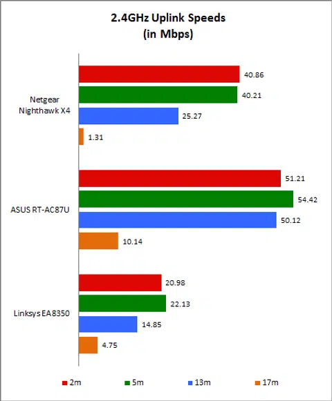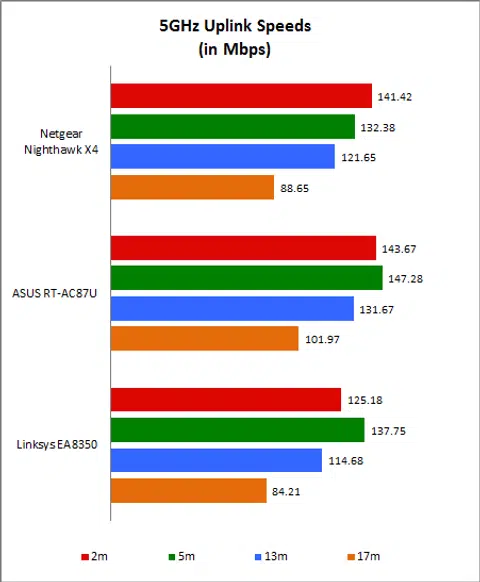 However, uplink speeds were not as good. At 2m, it was comparable with the ASUS RT-AC87U, but from there on, it started to fade quite quickly. Looking at the graphs, we noticed that uplink performance suffered the most when going from 13m to 17m. This was quite peculiar as its downlink performance was generally very strong.