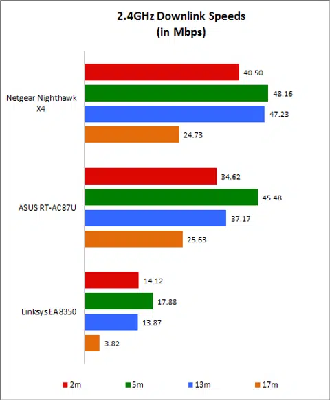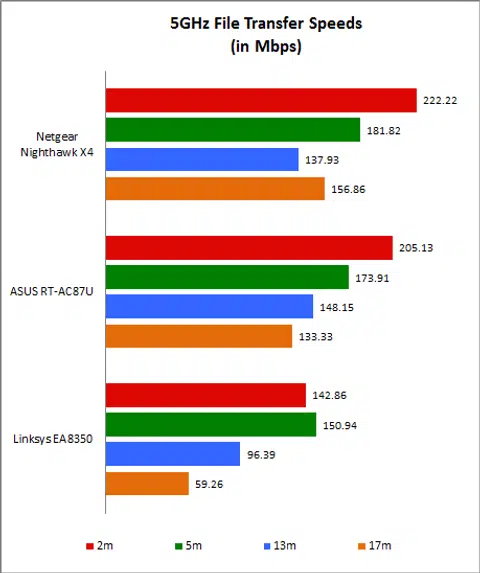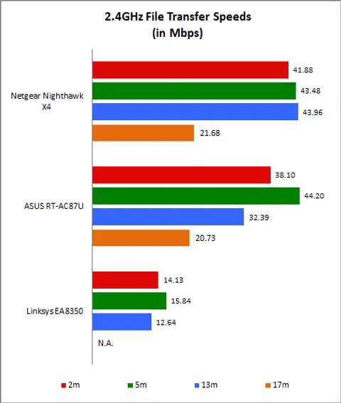 On the 2.4GHz band, the Netgear Nighthawk X4 exhibited very strong downlink performance, being mostly quicker than the ASUS RT-AC87U. Its performance at the 13m range was exceptionally strong. However, we also noticed that performance dipped quite drastically when going from 13m to 17m. The drop in performance from 13m to 17m was almost 50%. Its performance on our file transfer test was also very encouraging as it was faster than the ASUS RT-AC87U overall.