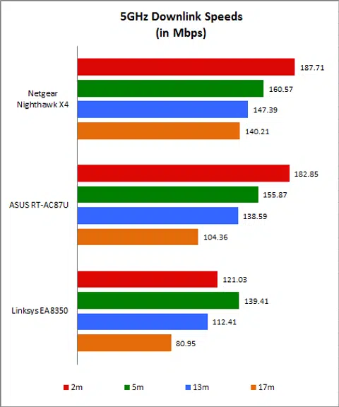 On the 5GHz band, the Netgear Nighthawk X4’s performance was quite impressive. Downlink speeds were generally very good, besting the ASUS RT-AC87U, and it also exhibited very good range. While other routers were tapering off, the Nighthawk X4 continued to maintain pretty consistent downlink speeds. This finding was confirmed in our real world file transfer tests too, although its performance stuttered somewhat at 13m.