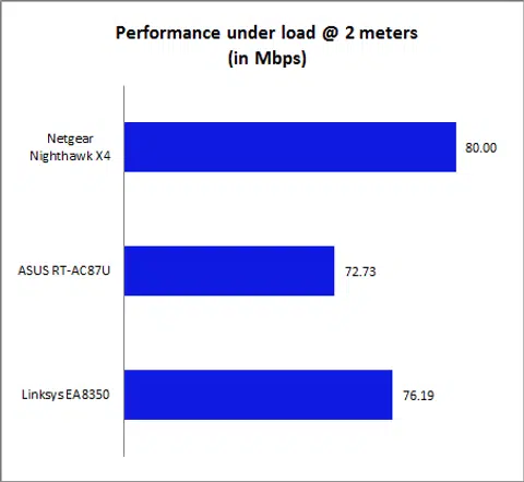 As for its performance under load, the Nighthawk X4 achieved the best result with a recorded speed of 80Mbps, which represents a 5% and 10% lead over the Linksys E8350 and ASUS RT-AC87U respectively.