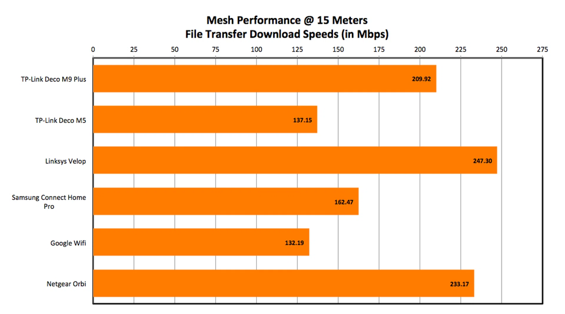 In this test, we placed a second TP-Link Deco M9 Plus node in between the first node and the 15-meter mark to create a mesh network to get signal to the problematic 15-meter mark. We did the same for other mesh networks to see how their performance would compare.