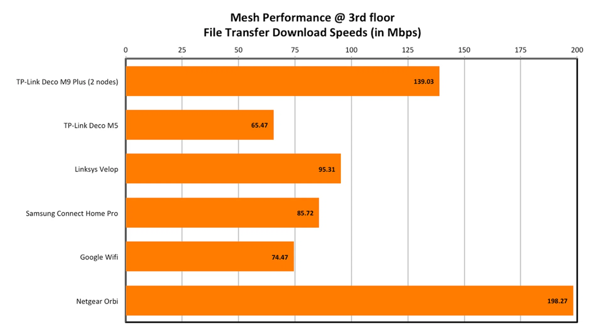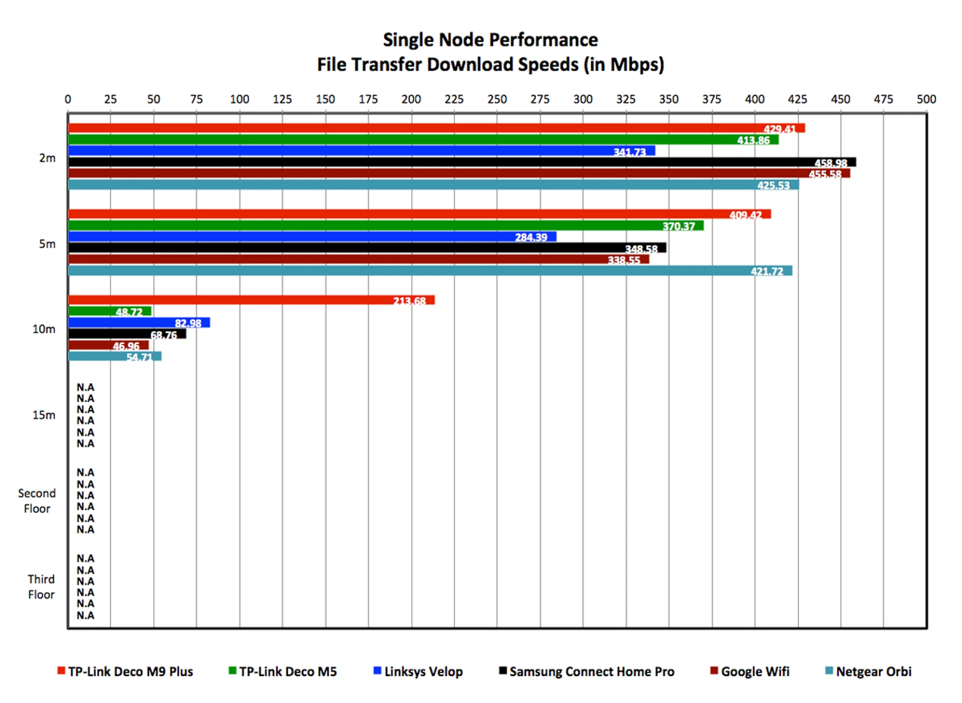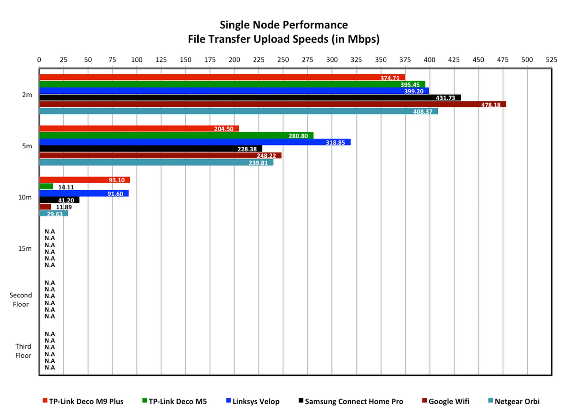 To further clarify, in tests where nodes were placed on the second or third floor, the measurement would be taken with the client device about two meters away from the node. Finally, included in the graphs are results of other mesh networking systems including the TP-Link Deco M5, Samsung Connect Home Pro, Google Wifi, Linksys Velop, and Netgear Orbi.