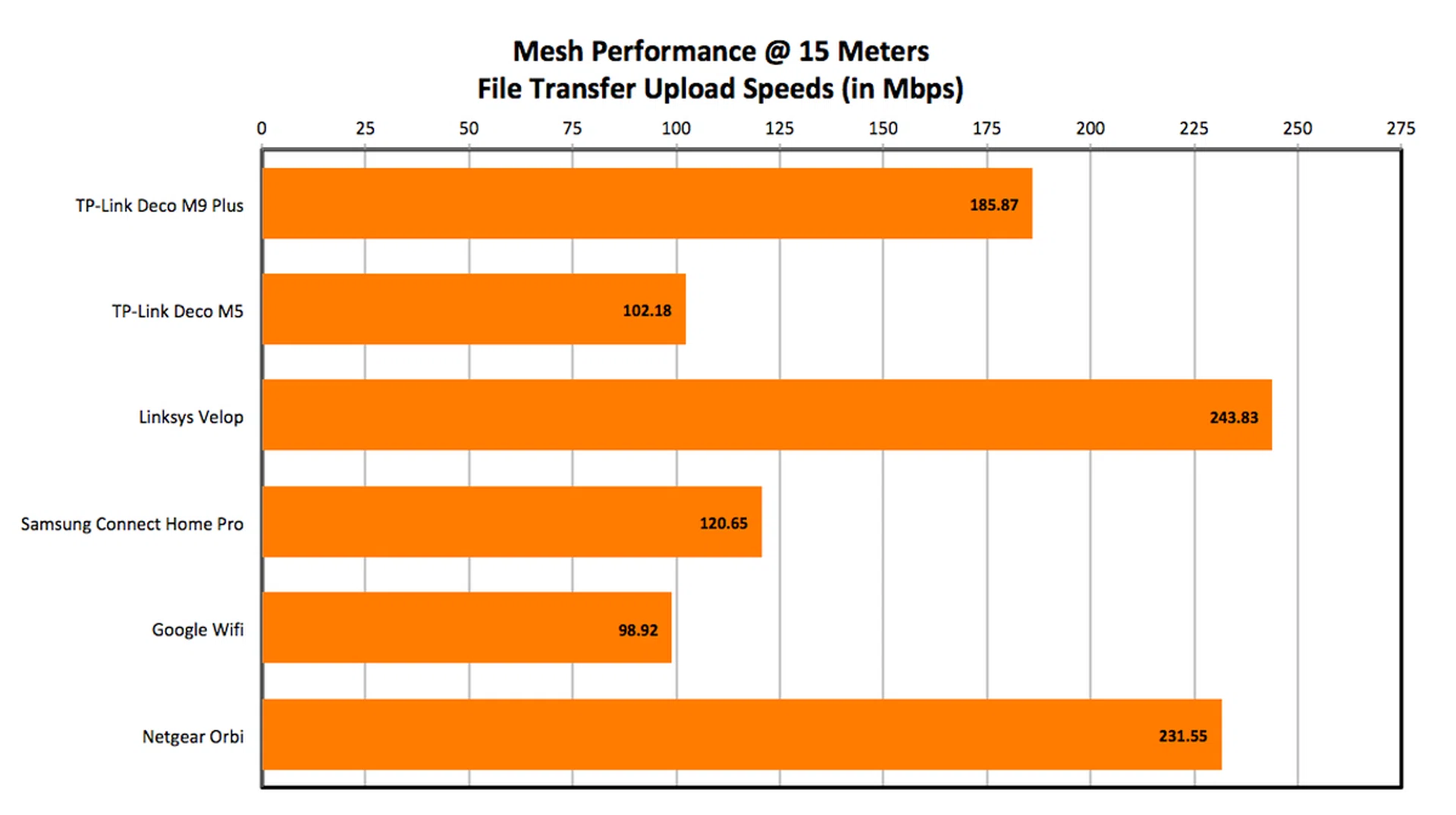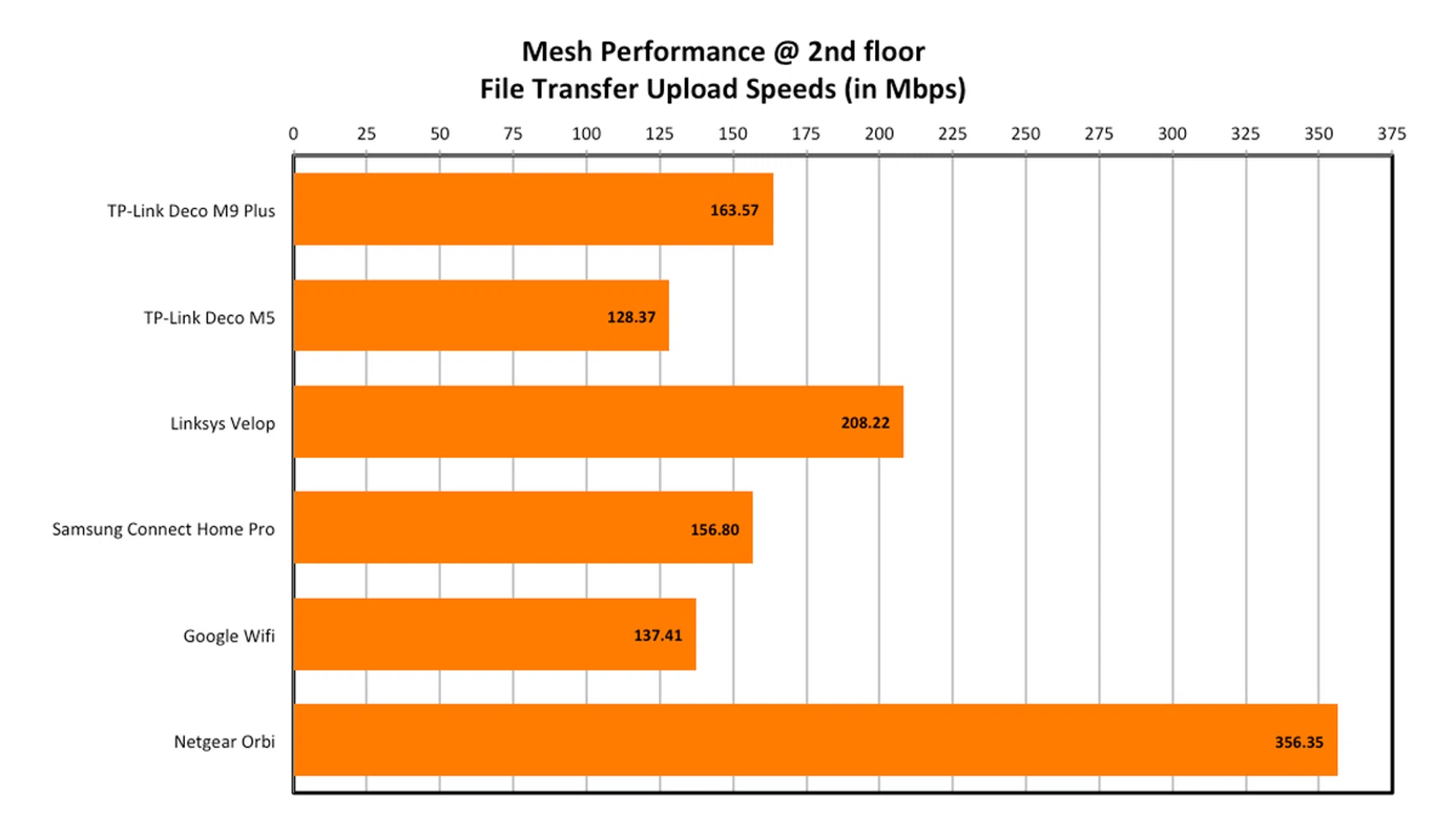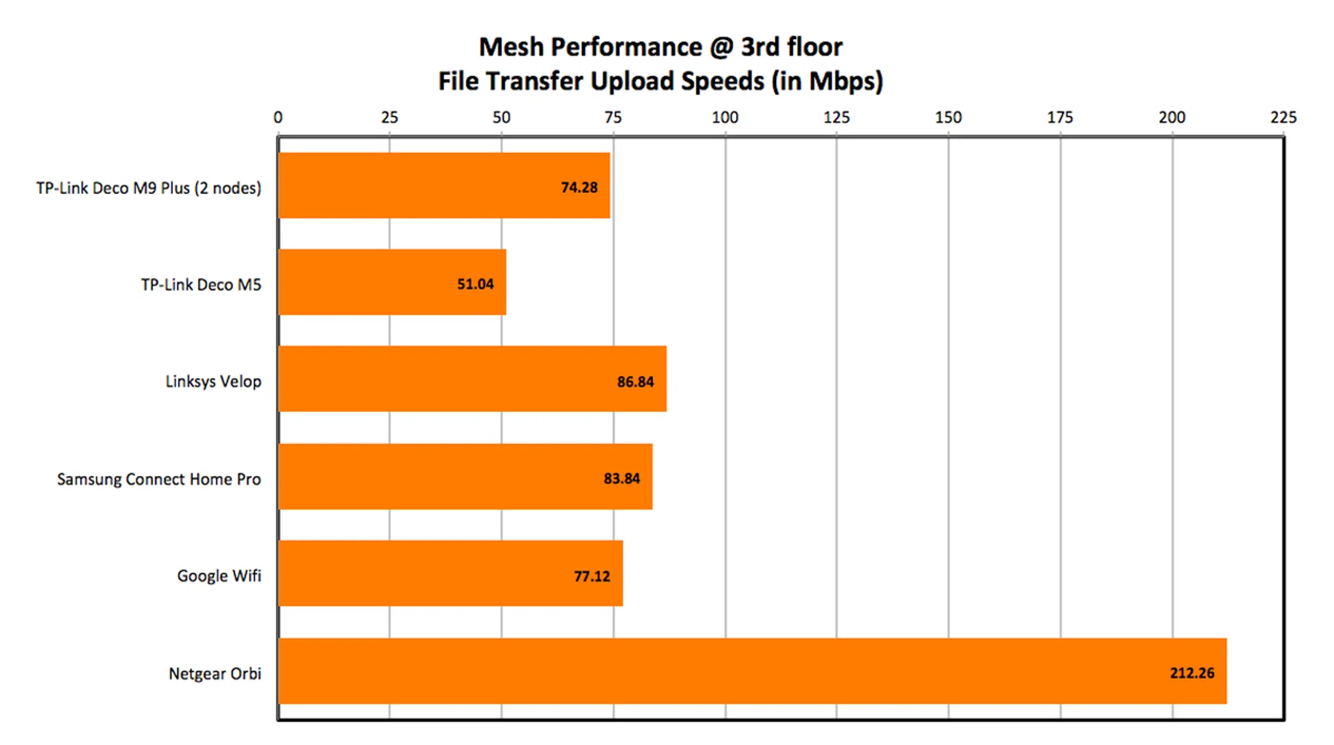 While the other systems had a third node, I was still connecting to the Deco M9 Plus node on the second floor for this test since the Deco M9 Plus only comes in a pack of two. Despite this, the Deco M9 Plus’ numbers were very respectable, which is a testament to its range. Its upload speeds were still faster than a 3-pack Deco M5 and its download speeds were surpassed only by the Netgear Orbi.