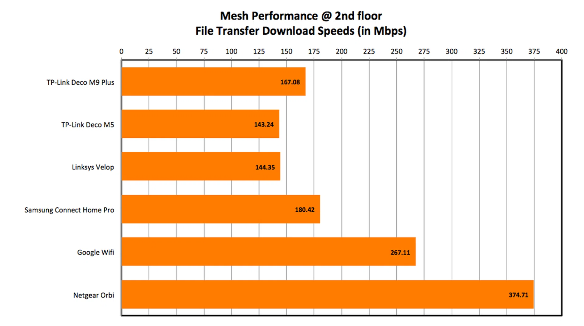 With a node on the second floor to bridge the distance between our client device and the main router, we got mixed performance. Its upload speed was one of the highest, behind only the Linksys Velop and Netgear Orbi. Its download speed, however, was a little disappointing as it trailed the Netgear Orbi, Google Wifi, and Samsung Connect Home Pro.