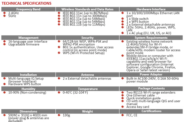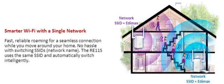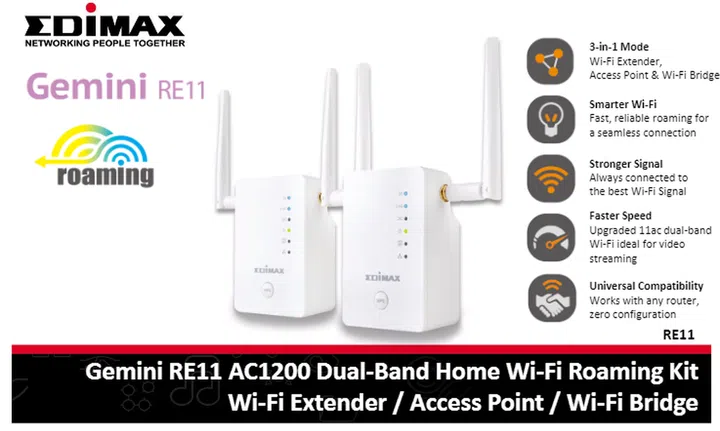 The home Wi-Fi kit can also act as an access point or as a Wi-Fi bridge, depending on your needs. The RE11 also facilitates Wi-Fi roaming with its single SSID across its Wi-Fi network.