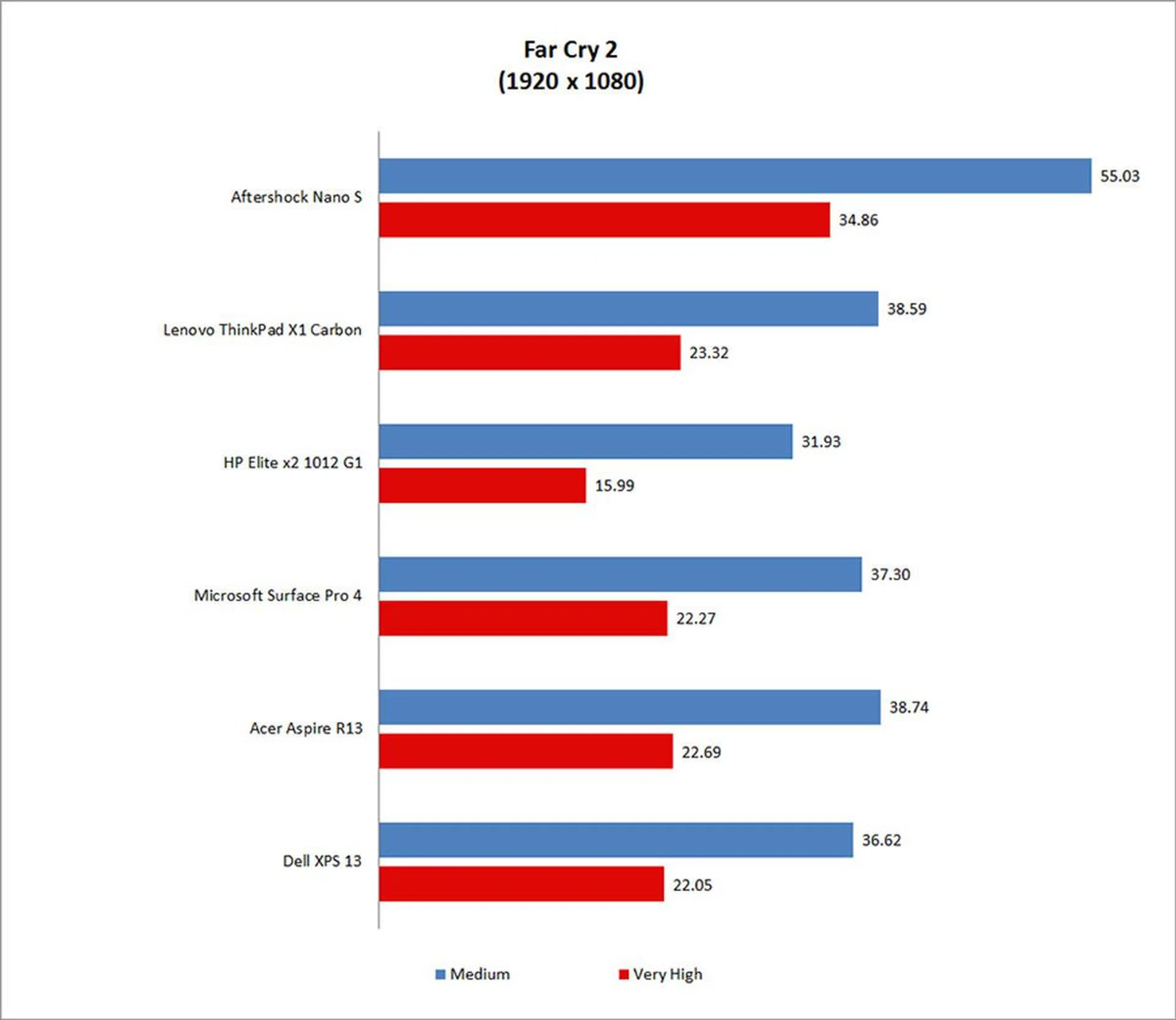 Far Cry 2 is even easier to run than Tomb Raider, and the Nano S pushed out close to 60fps, or 55.03fps to be exact, at Medium settings. At Very High settings, it was still 49 per cent quicker than the top performing ThinkPad X1 Carbon.