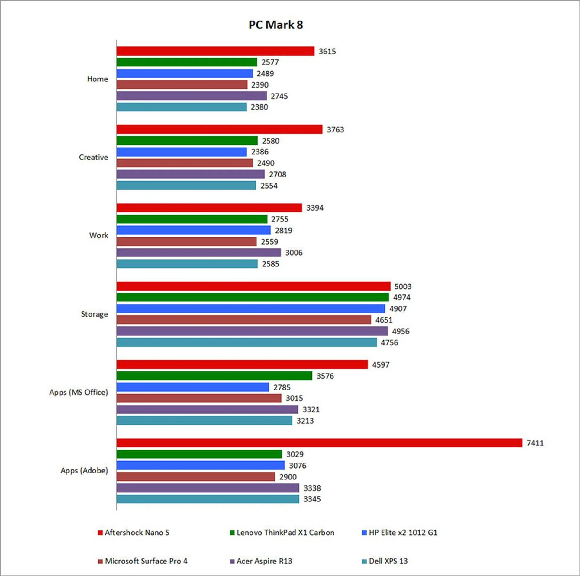 Since the Nano S is intended as portable workstation, we think it reasonable to compare it to other machines you might use in an office setting. And since these are all notebooks, you get an idea of how much of a performance boost you can get from Aftershock’s mini desktop.