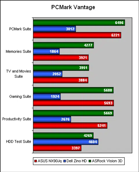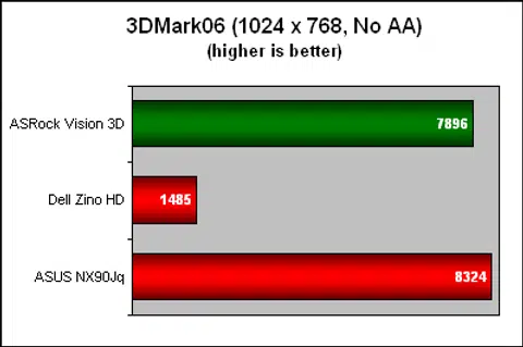 Thanks to a better performing hard drive, the ASRock edged out the Core i7 powered ASUS NX90Jq in PCMark Vantage. The two systems were evenly matched for most of this benchmark with the decisive blow coming in the HDD segment. The AMD powered Dell Zino HD was predictably off the pace with its older, integrated graphics. 3DMark06 saw the ASUS getting the better of the Vision 3D but the results were very close and Far Cry 2 confirmed that the two had similar graphical performance.