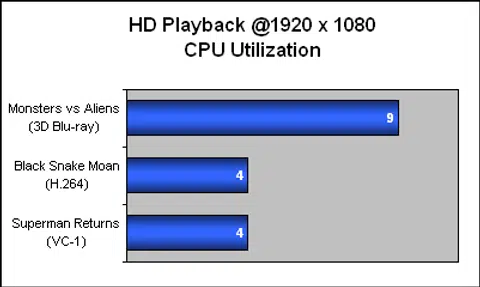 Next, we tested the 3D Blu-ray support present. We were fortunate to have NVIDIA's 3D Vision kit with us and a suitable LG 3D Vision capable monitor to test. Using a similar test scenario that we outlined in our , we found the 3D playback of Monsters vs Aliens to be smooth and trouble-free. Setting up the 3D Vision was a matter of installing the proper drivers and software like the bundled CyberLink PowerDVD 10. Check out the low CPU utilization rates in the chart below.