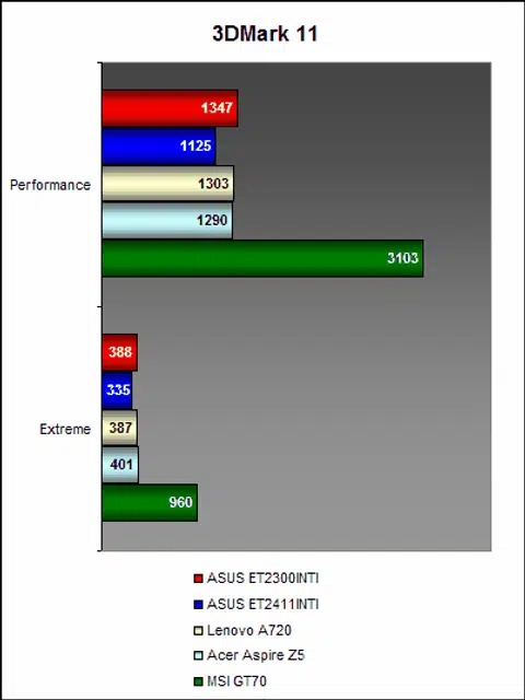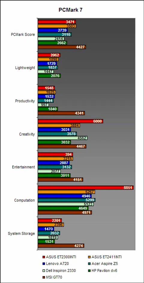 The ASUS ET2300INTI was matched by the Lenovo A720 and Acer Aspire Z5 AIOs. Also, it scored about 19% higher than the old ET2411INTI. However, it’s no match for the HP Pavilion dv6 and MSI GT70, both of which have much more powerful discrete graphics chips.