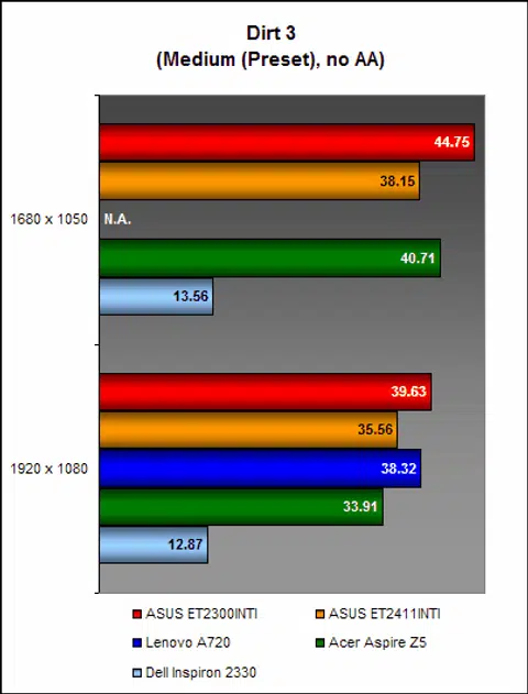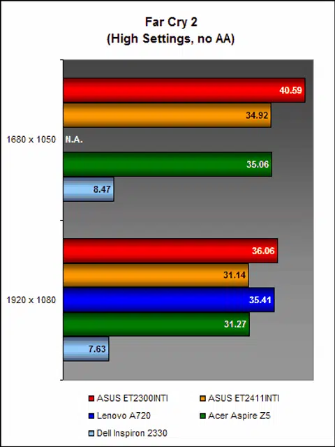 On real world gaming benchmarks such as Dirt 3 and Far Cry 2, the ASUS ET2300INTI was the quickest amongst the AIOs. Despite having the same NVIDIA GT630M discrete graphics as the ASUS ET2411INTI, Lenovo A720 and Acer Aspire Z5, the ET2300INTI was about 10% quicker when running at 1680 x 1050. However, looking at the results when running at its native 1080p resolution, we saw that the ET2300INTI was only negligibly quicker.