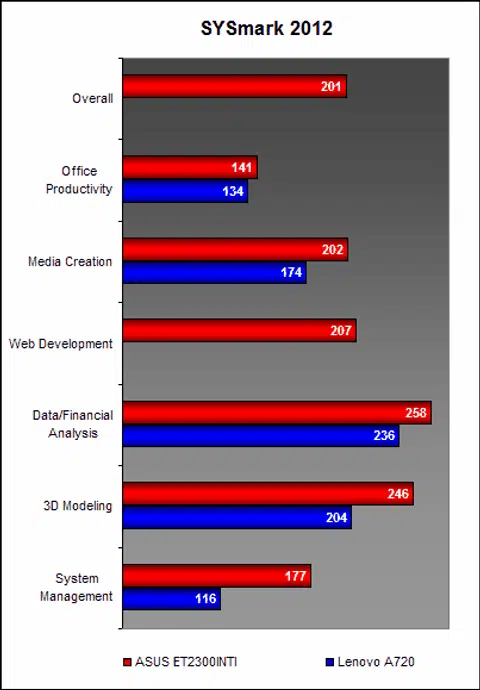 Since we haven’t had the time to call in the rest of the AIOs to be retested with SYSMark 2012, we will have to make do with comparisons against the Lenovo A720. Also, the Lenovo A720 had problems completed the Web Development workloads, hence it also failed to generate an overall score. Nevertheless, looking at the individual breakdown of scores, it is apparent that the ASUS ET2300INTI is the better performer.