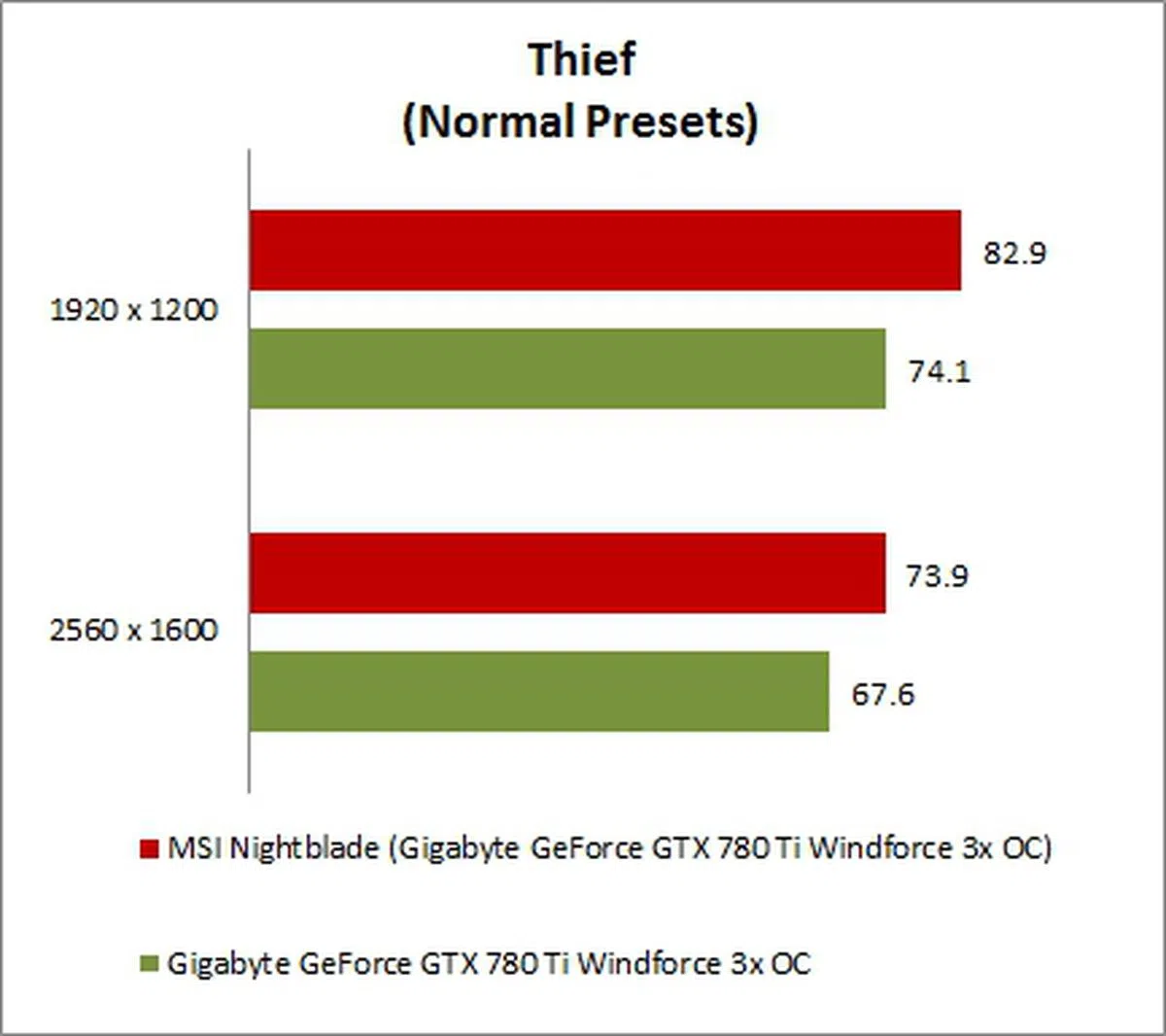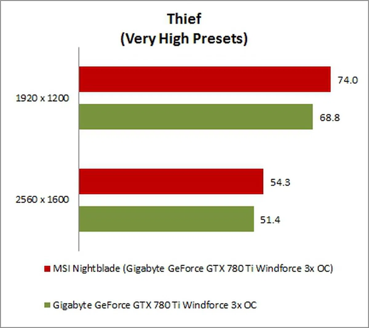 We can see that the gaming performance of the systems vary from test to test. For the artificial benchmarks of 3DMark, our usual graphics test bed turned in slightly better scores. However, the MSI Nightblade system turned in better performance figures when measured using the in-game benchmark of Thief.
