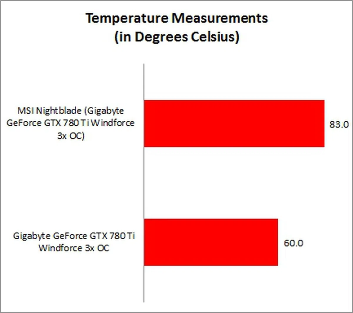 As noted in out temperature test segment, the card reached a high of 83 degrees Celsius, and while in our open workbench graphics test bed, its temperature was a low of 60 degrees. This is why it's important to invest in a graphics card that has excellent cooling capability. For the GeForce GTX 780 Ti class, Gigabyte's Windforce 3x OC tops our charts.