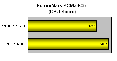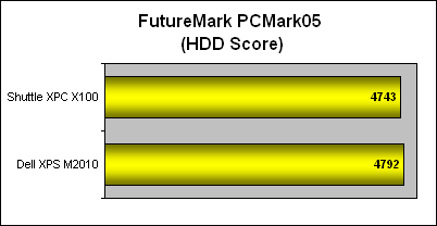 Compared to the monster desktop replacement notebook that is the Dell XPS M2010, the Shuttle is hardly the right contender to it in PCMark05. However, given the limited scores we can accumulate on notebook-class systems, we have to make-do with the comparisons available. Only the hard drive scores were close, since both systems used 7200RPM SATA hard drives with 8MB buffers, the result was not surprising. But for the other important aspects like the CPU and overall System score, the faster processor and additional memory made all the difference and thus there was a sizable gulf in performance between the two. Given the differential between the two systems, the outcome of the Shuttle XPC X100 is quite decent.