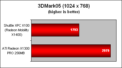 The Shuttle XPC X100 is not for gaming as these rather pathetic 3DMark05 scores attest. Deriving a large portion of its memory from the system is a major disadvantage. Considering that the X100 only has 512MB of system memory in total, there isn't too much to go around. The discrete Radeon X1300 PRO (as tested on our graphics testbed), which is architecturally similar to the Mobility Radeon X1400, easily outperforms the mobile unit on the Shuttle XPC X100 by around 66%. Considering that the Radeon X1300 PRO itself isn't much of a modern gaming ally, you can tell that the Mobility Radeon X1400 won't be of much help in the latest games. However, it plays a crucial role for accelerating video playback using its Avivo engine, and that's its primarily role for being incorporated in the X100 media PC.