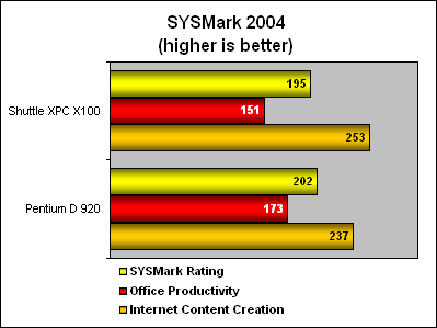 The SYSmark 2004 results show the Shuttle XPC X100 slightly slower than the Pentium D 920. It did quite well in the Internet Content Creation section but faltered for Office Productivity. Of course this is not a fair apples-to-apples comparison but it does help to put the performance of the X100 in perspective with a mainstream retail processor. More RAM on the X100 would have certainly helped boosted its scores here, but it was just too bad it came outfitted with 512MB of memory.