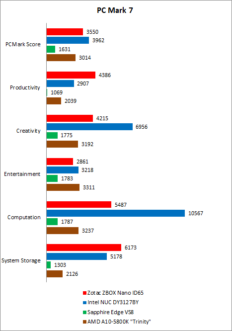 Overall, the Zotac ZBOX nano ID65 scored about 11% less than the Intel NUC mini-PC. However, the breakdown of the scores paints an interesting picture. On the “Productivity” workload, the ZBOX nano ID65 had the clear upper-hand, but conceded to the Intel NUC mini-PC when it came to the “Creativity”, “Entertainment” and “Computation” workloads, regaining the upper-hand only when it came to “System Storage”. The ZBOX nano ID65 was miles ahead of the Sapphire Edge VS8 and held a convincing lead over the AMD A10-5800K APU.