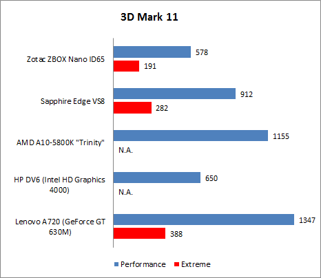 As we can see from 3DMark 11, the Intel HD Graphics 4000 integrated GPU is clearly no match for AMD’s integrated GPU solutions. Comparing the ZBOX nano ID65 against the HP DV6, both of which have similar Intel integrated GPUs, we noticed a 12% difference in performance in favor of the HP DV6. We did not have results from the Intel NUC mini-PC because it failed to complete this benchmark.