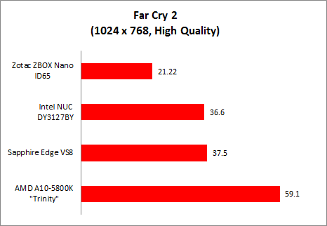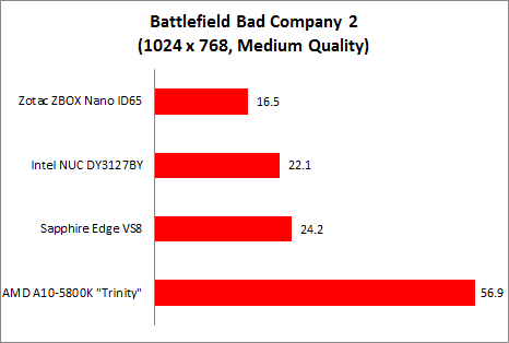 On Battlefield Bad Company 2, we saw that the ZBOX nano ID65 once again posted much lower frame rates than the Intel NUC mini-PC, despite the two having the same Intel HD Graphics 4000 integrated GPU. The difference in performance is about 35% and can be attributed again to the ZBOX’s single-channel memory implementation.