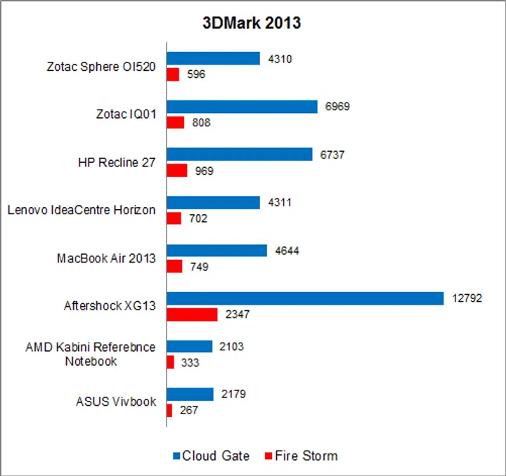 The ZBOX Sphere OI520’s Core i5-4200U processor is paired with the Intel HD Graphics 4400 integrated GPU, which, frankly speaking, is not the greatest of integrated GPUs. And this is evidenced by its results on 3DMark 2013. Even the MacBook Air was quicker, by around 7% on the less intensive Cloud Gate scenario and over 25% on the more intensive Fire Storm scenario. It was also beaten by the Lenovo IdeaCenter Horizon, which is powered by an NVIDIA GeForce GT 620M GPU that was first announced over two years ago. Graphics, we think, is not going to be one of the ZBOX Sphere OI520’s strong suits.