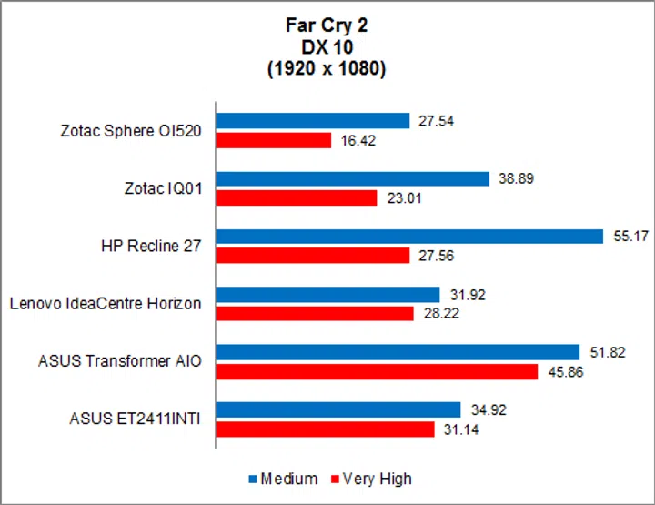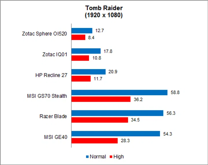 Next we move on to gaming performance using real world benchmarks and we begin with testing at 1080p resolution on Far Cry 2 and Tomb Raider. Expectedly, the ZBOX Sphere OI520’s showing on Far Cry 2 was not encouraging as it failed to even manage playable frame rates of above 30 fps on “Medium” settings. When we increased the graphics settings to “Very High”, frame rates fell even further to just 16.42 fps, making the game mostly unplayable. At least the ZBOX IQ01 could manage decently playable frame rates at “Medium” settings. The AIOs with their discrete entry-level GPUs, managed to do better, even if only on the “Medium” settings.