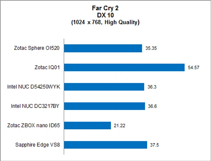 Now we turn to results at a more modest 1024 x 768 pixels resolution, and thankfully, the ZBOX Sphere OI520 managed playable frame rates on Far Cry 2 at the “High” setting. And was about on a par with the Intel NUC D54250WYK kit and the older NUC DC3217BY kit. However, the ZBOX IQ01 was still significantly faster.