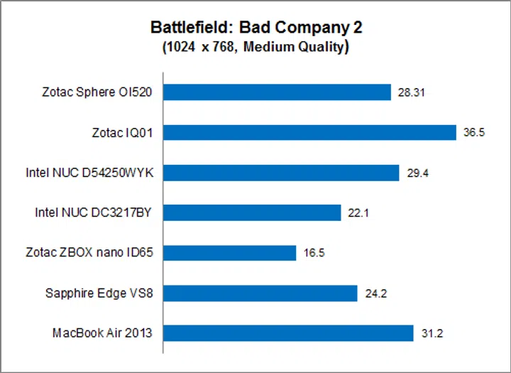 Finally, we were disappointed that ZBOX Sphere OI520 did not manage to break the 30 fps playable threshold mark on Battlefield: Bad Company 2, and managed only 28.31 fps instead, which is about comparable to the Intel NUC D54250WYK kit’s 29.4 fps. Overall, we were disappointed that the ZBOX Sphere OI520 failed to handle a four-year old game convincingly.