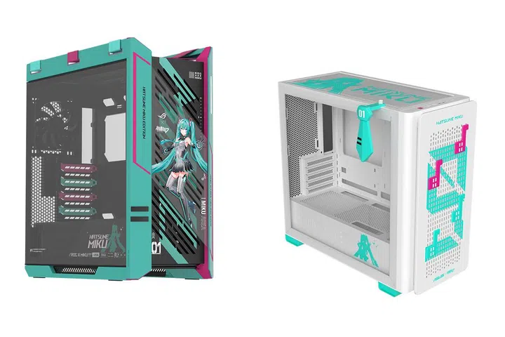 The ASUS A23 (right) is the only non-ROG product to be included in this collab, but it provides a nice balance with the more garish Strix Helios II Hatsune Miku Edition. Image: ASUS.
