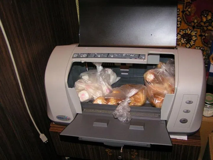 Clearly someone thought it would be a good idea to store bread in this old printer. Well, it seems to be working well enough.
