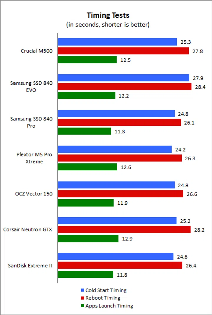 Looking at our timing tests, we can say that compared to the Samsung SSD 840 EVO, the Crucial M500 was faster on a whole. From a cold start, the Crucial M500 managed to boot up a whopping 2.6 seconds faster - which is considerable for SSDs. It was also faster at rebooting the system, managing 27.8 seconds compared to the SSD 840 EVO’s 28.4 seconds. However, when it came to launching apps, the SSD 840 EVO was three-tenths of a second faster.