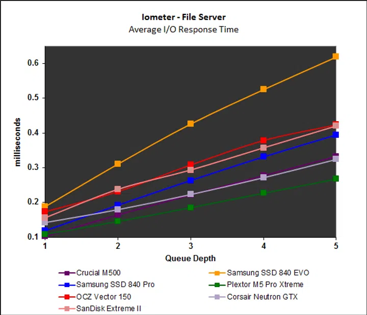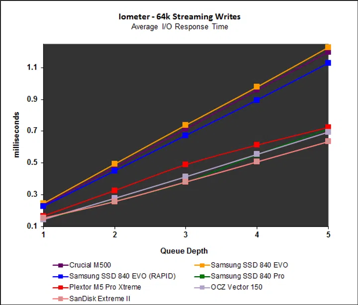 Finally, we look at the I/O response times for the workloads reported on the previous page. In the introduction of this shootout, we mentioned that TLC NAND would suffer from latency issues, but as the benchmarks have shown, the Samsung SSD 840 EVO manages to overcome this well, though there instances where its performance was found slightly wanting. Also, we can see that when it comes to write workloads, their poor performance can be attributed to their very high response times.
