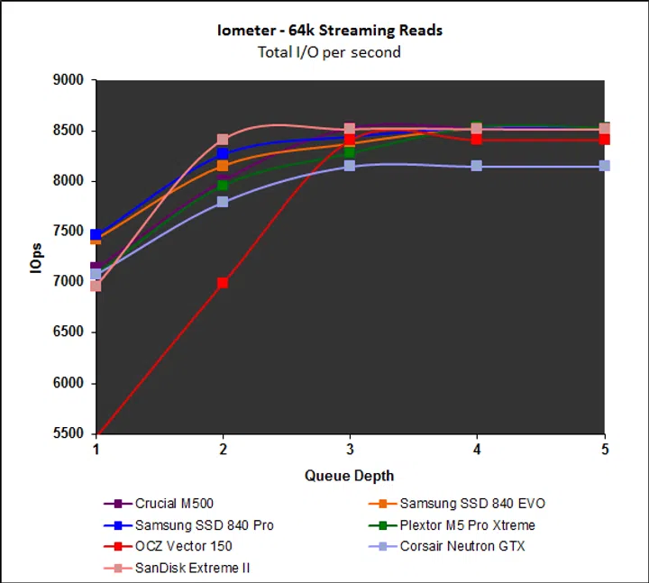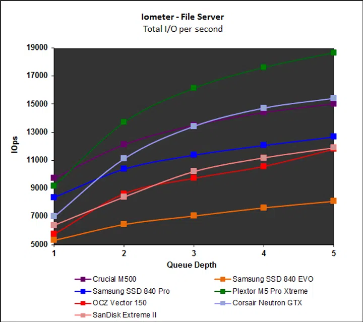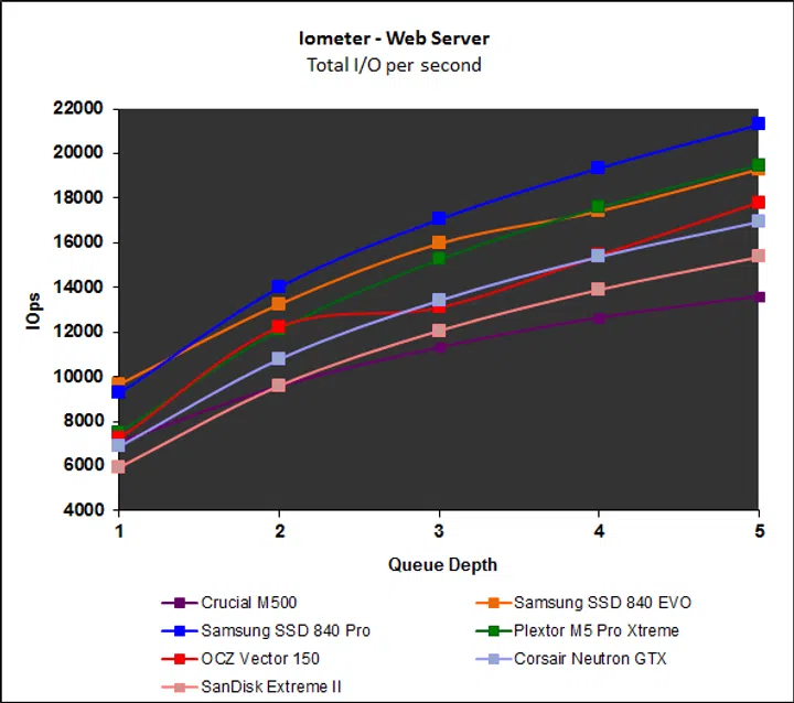 Lastly, we put the drives through the rigorous grind of Iometer, with different workloads and I/O queue depths. We have chosen to show results from a queue depth of 1 to 5 as this better represents the workloads a typical consumer might face.