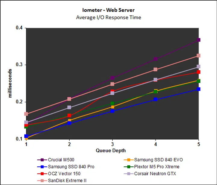The SSD 840 EVO’s performance on the File Server workload was particularly poor, but it picked itself up on the Web Server workload. On the flip side, while the M500 managed to put in a decent shift on the File Server workload, subsequently, it managed the lowest IOPS on the Web Server workload.