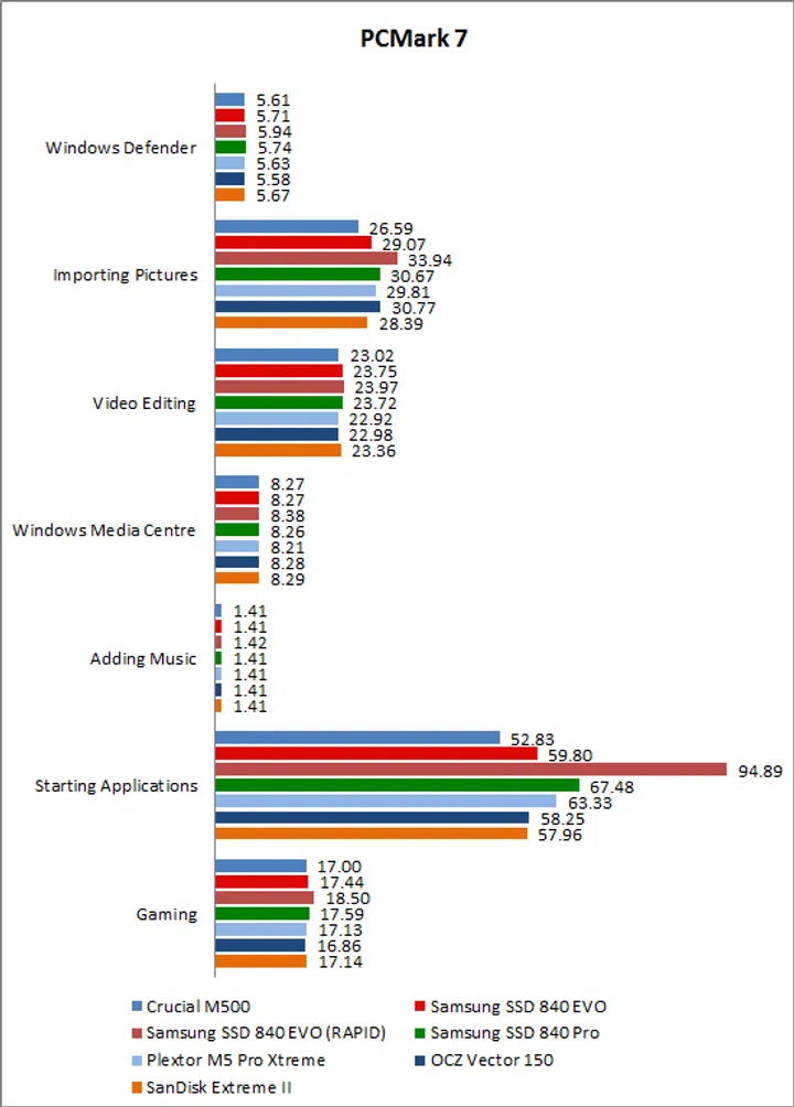 The Samsung SSD 840 EVO narrowly edged out the Crucial M500 on PCMark 7, scoring about 4% more. The SSD 840 EVO’s scores were also comparable to the Plextor M5 Pro Xtreme and OCZ Vector 150. Looking at the score breakdown, we can see that the Samsung SSD 840 EVO edges the Cruclal M500 in the Importing Pictures, Starting Applications and Gaming workloads.