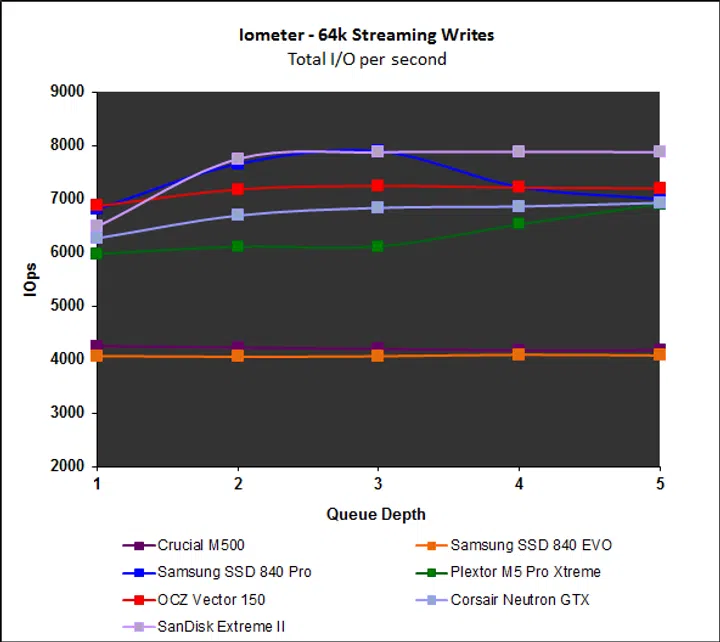 Despite the Samsung SSD 840 EVO’s glowing performances in earlier benchmarks, Iometer proved to be too demanding for the drive as we see it posting somewhat erratic results. Modern SSDs have impressive read speeds and there was little to separate the Crucial M500 and Samsung SSD 840 EVO, and indeed the rest of the drives, on the 64K streaming reads workload. Write performance of mainstream drives tend to be poorer and this was confirmed when we look at the graph of the 64K streaming writes workloads where both the M500 and SSD 840 EVO managed to lowest IOPS.