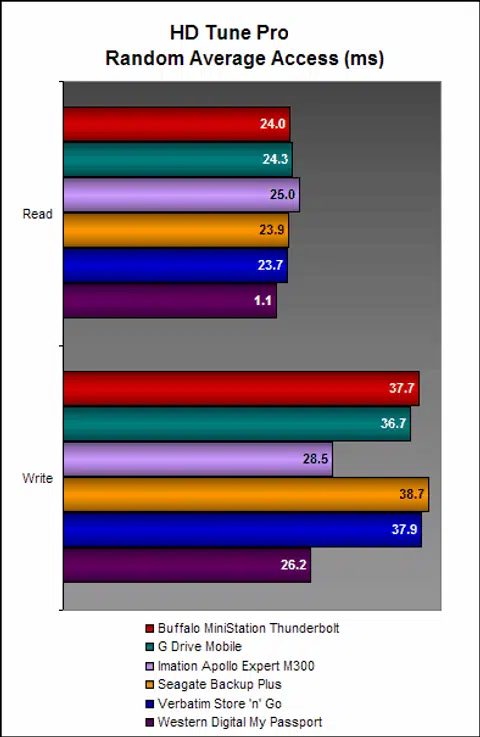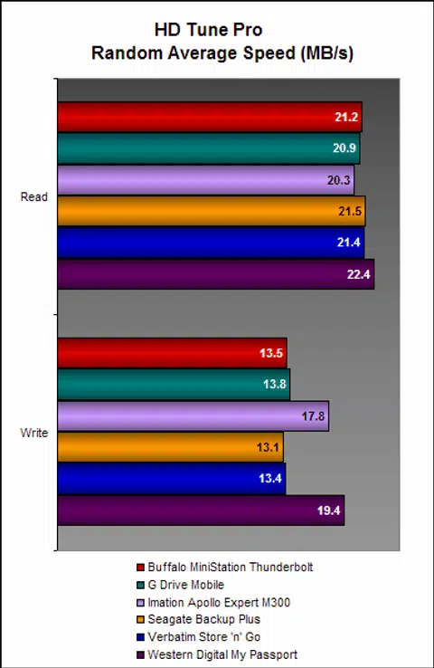 Random access performance revealed slightly greater variation in performance. This time, random read access of the drives were nearly almost identical; but random write performance saw two standout drives in the form of the Imation Apollo Expert M300 and Western Digital My Passport. Looking at their average random speeds, they were both about 30% to 40% faster than the rest of the drives.