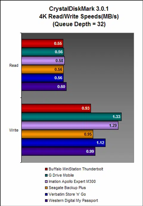 Looking at sequential read and write performance, the Buffalo MiniStation Thunderbolt was the clear victor, followed by the Seagate and Verbatim drives. However, as we investigate further by looking at 512k, 4kb and 4kb, queue depth 32 performance, we can see that the Buffalo drive pales in comparison to both the Imation and Western Digital drives. In fact, the Western Digital My Passport drive was the most consistent top performer in this benchmark.