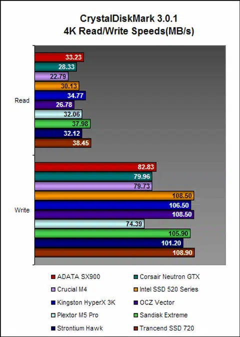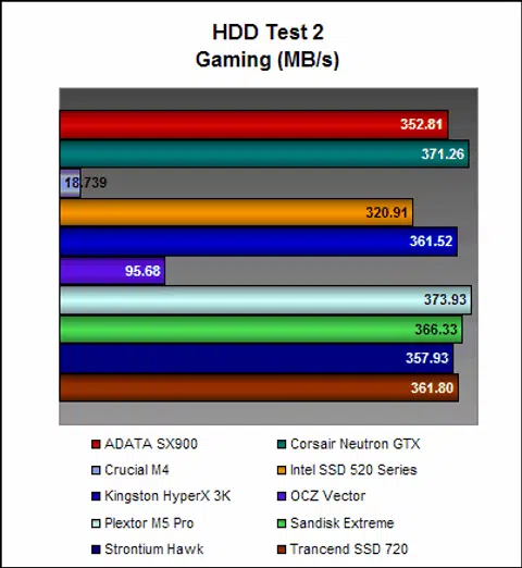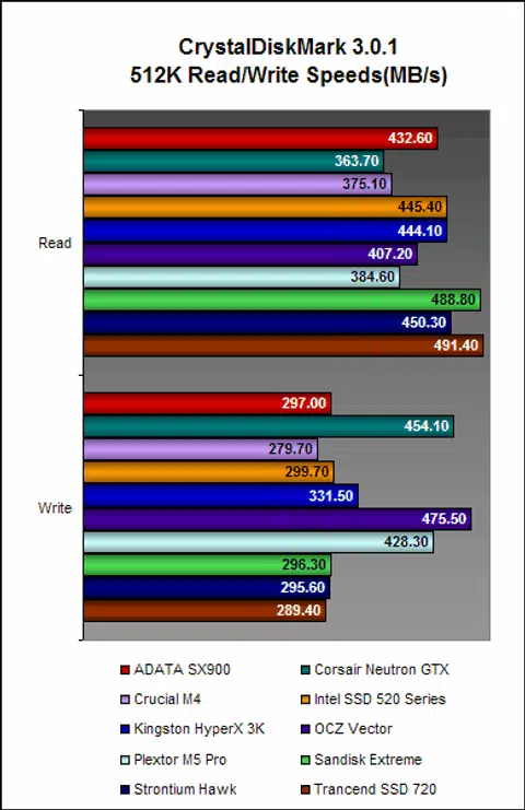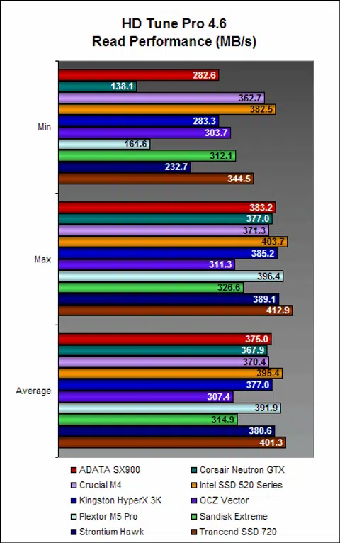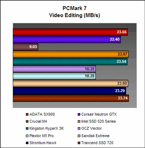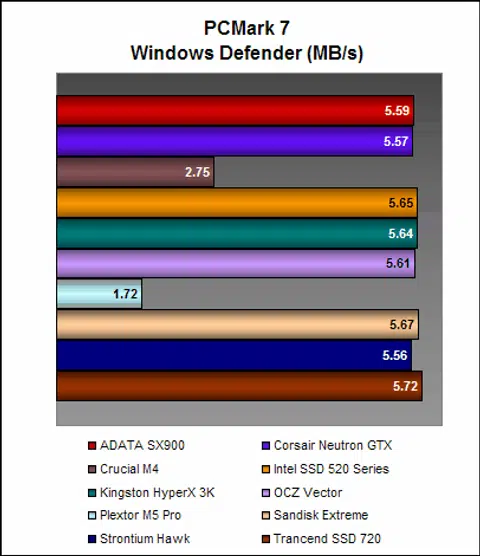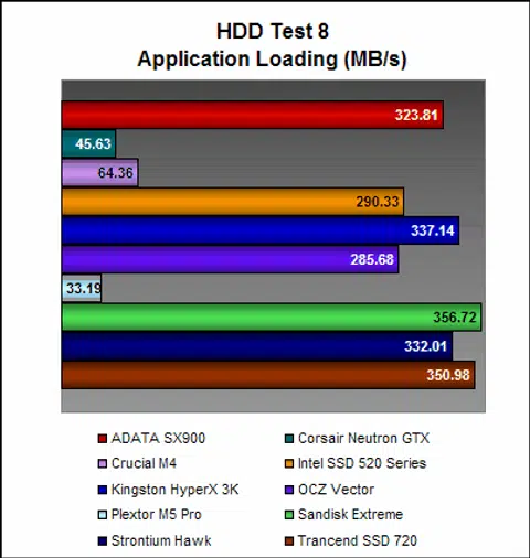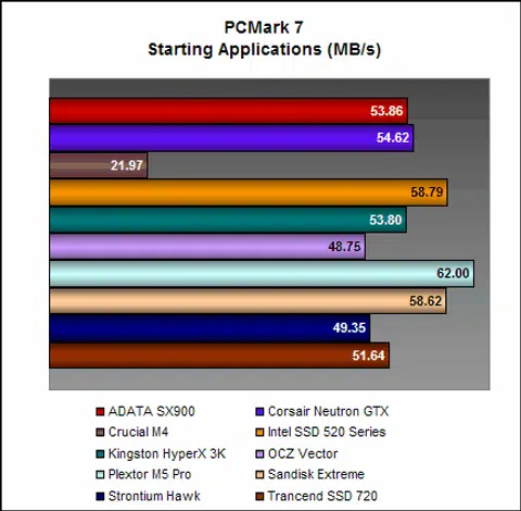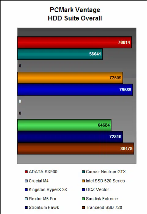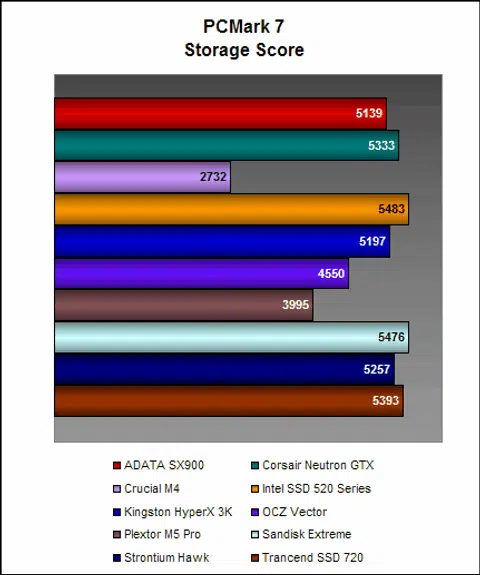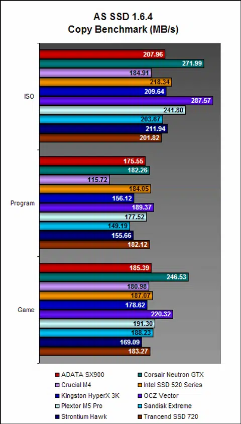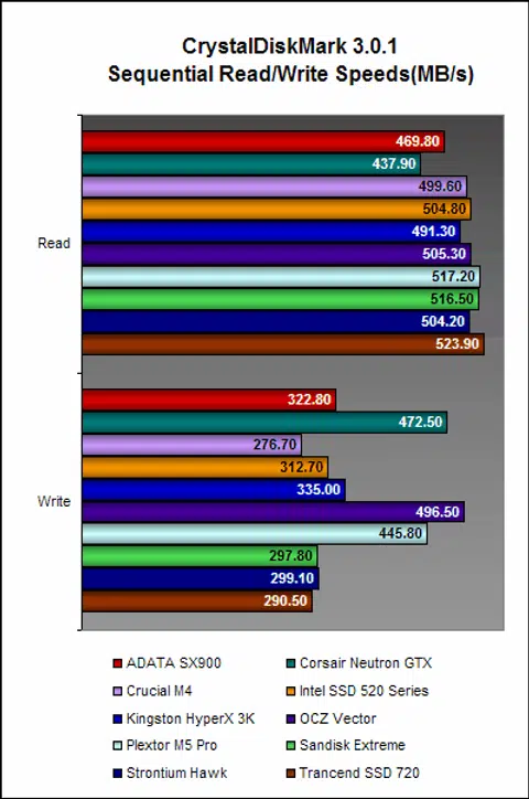 ADATA XPGSX900 | Corsair Neutron GTX | Crucial M4 | Intel SSD 520 Series | Kingston HyperX 3K | OCZVector | Plextor M5 Pro | SanDisk Extreme | Strontium Hawk | Transcend SSD720 | |