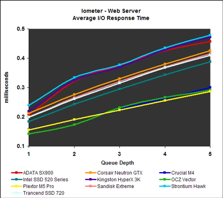 Lastly, we put the drives through the rigorous grind of Iometer, with different workloads and I/O queue depths. We have chosen to show results from a queue depth of 1 to 5 as this better represents the workloads a typical consumer might face.