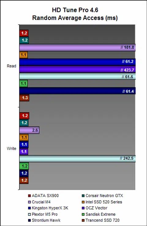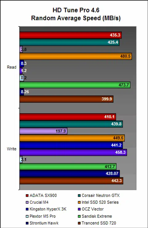 HD Tune is one of the most popular and widely-used benchmarking tools for measuring the performance of storage drives. On this benchmark, it was the Intel SSD 520 Series that impressed us the most, racking in the highest random average access speeds in this test. Other drives that performed well in this benchmark include the ADATA XPG SX900, Corsair Neutron GTX and Transcend SSD720.