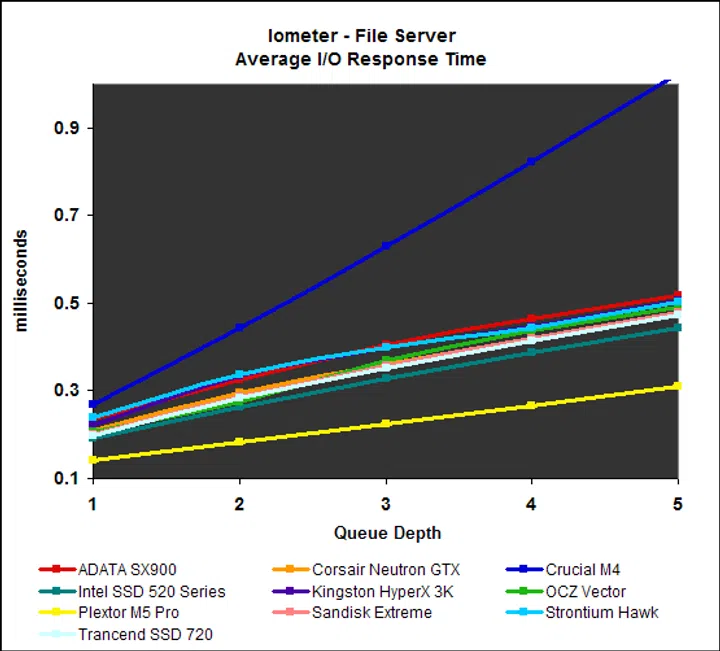 Finally, we look at the I/O response times for the workloads reported on the previous page. And looking at the graphs, we can see that the Corsair, OCZ and Plextor drives all have very low response times, which attributed to their high IOPS readings on the previous page.