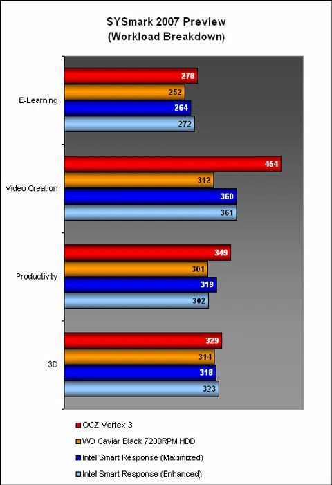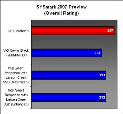 Our two main system-wide benchmarks showed the OCZ Vertex 3 taking a significant lead over the Intel SRT systems, a 10% overall in SYSmark 2007 and a more lopsided 34% overall in PCMark. Our qualitative tests painted a more competitive picture, with the Vertex 3 system booting into Windows in an average time of 13.7 seconds compared to 14.8 seconds for the Intel SRT. The time taken to open 20 tabs in Firefox 4.0 also went to the Vertex 3 narrowly, 12.4 against 14.8 seconds.