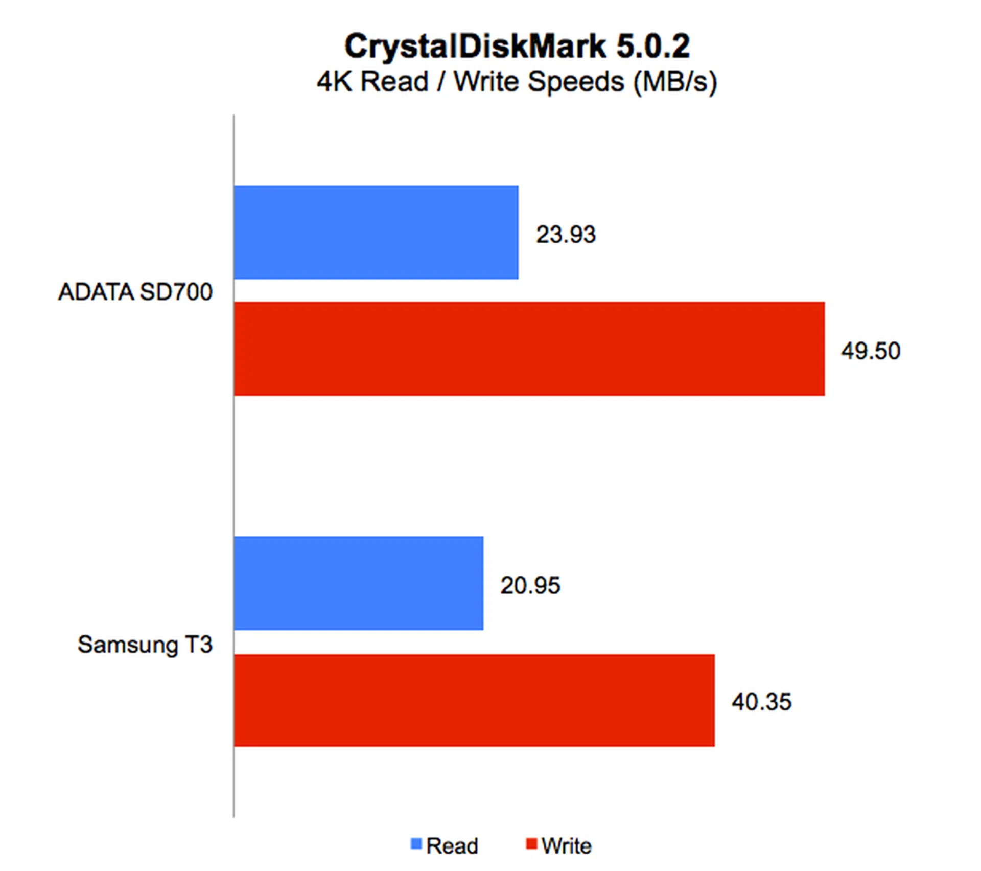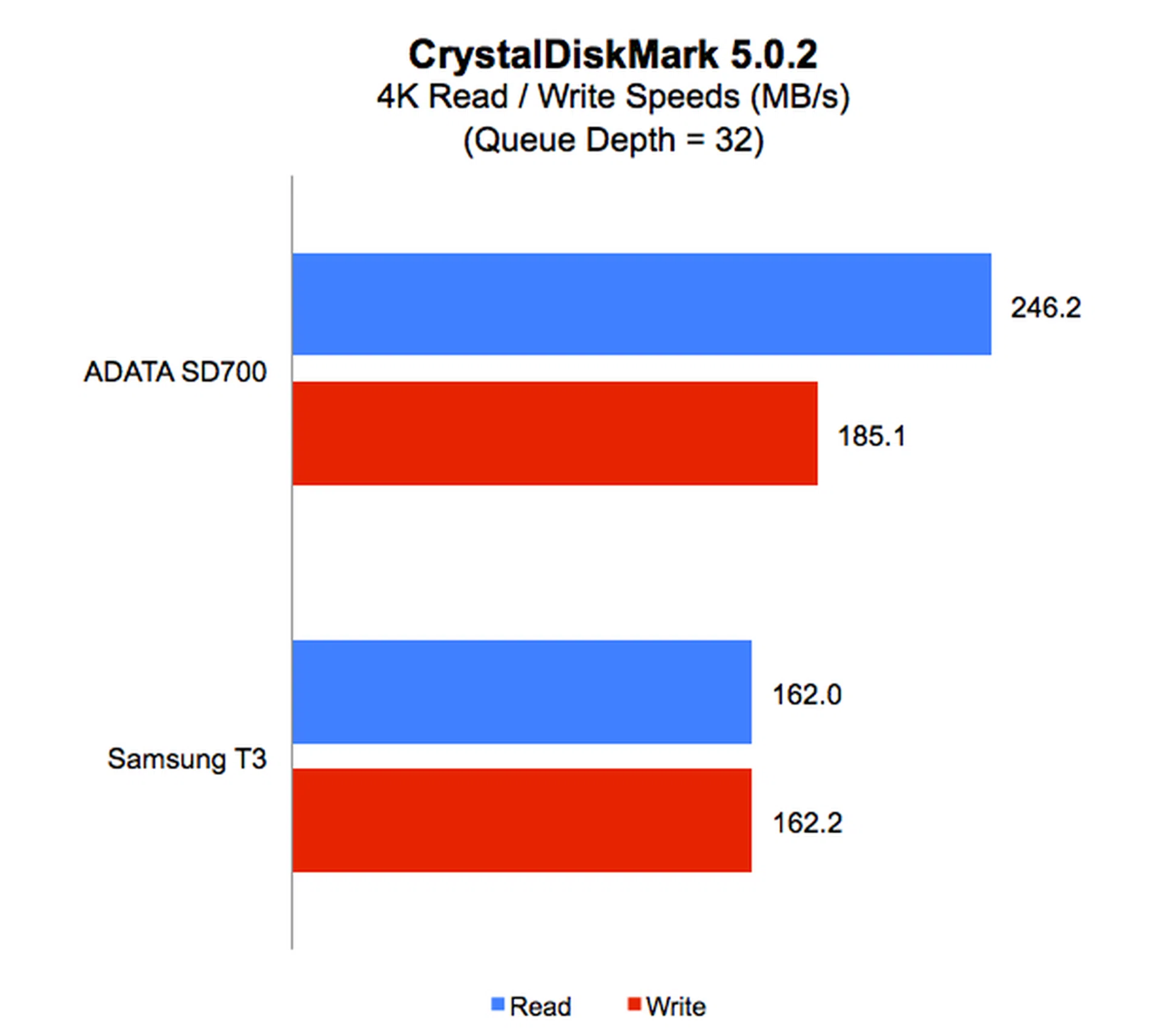 When it came to smaller 4K data blocks, the SD700’s performance advantage over the T3 grew to around 18%. It was 15% faster when it came to 4K reads and over 22% faster on 4K writes.