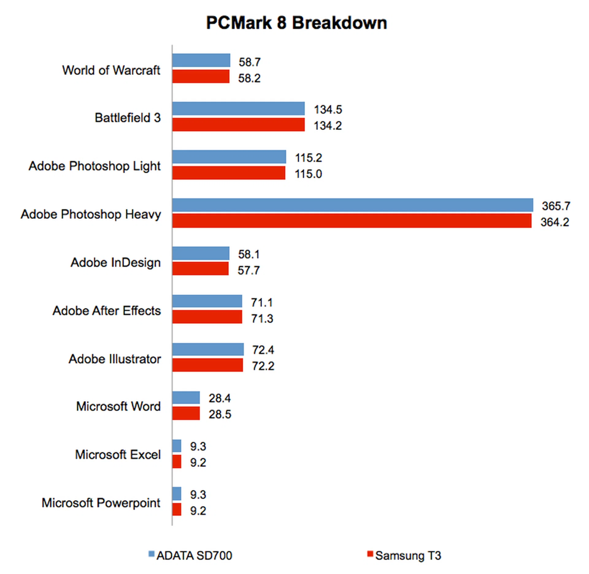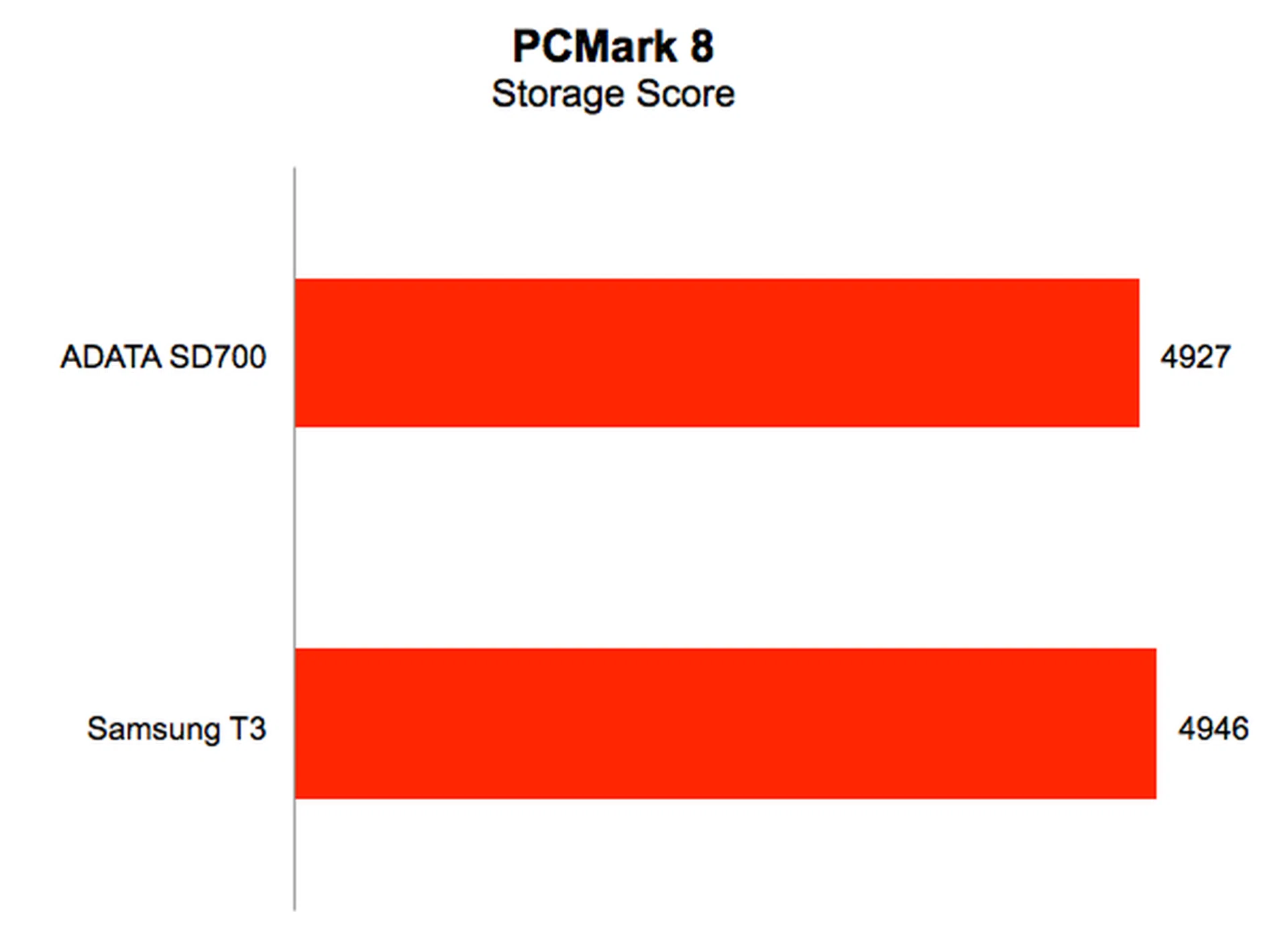 On PCMark 8, the two drives recorded very comparable scores, with the Samsung T3 nudging slightly ahead with a score of 4946 - just a mere 19 points more. If we look at the average speed recorded, the T3 managed 229MB/s, which was about 8.5% more than the SD700’s 211.24MB/s. What this all means is that, on PCMark 8 at least, the two drives are very closely matched.