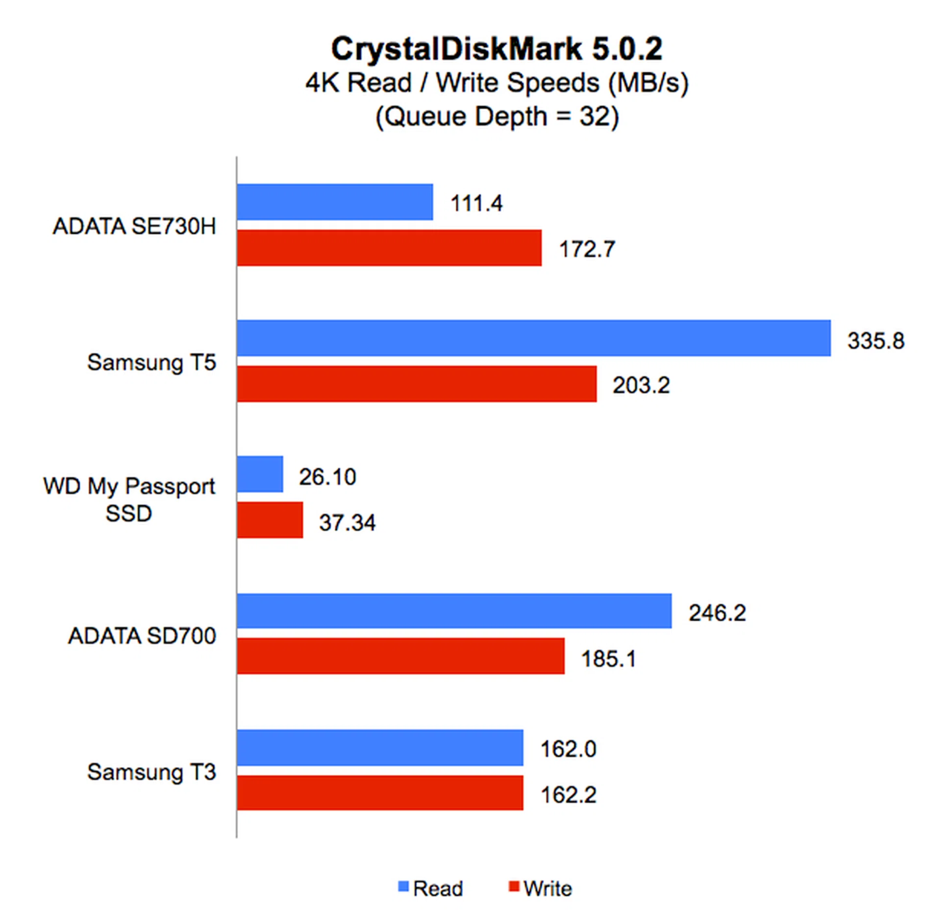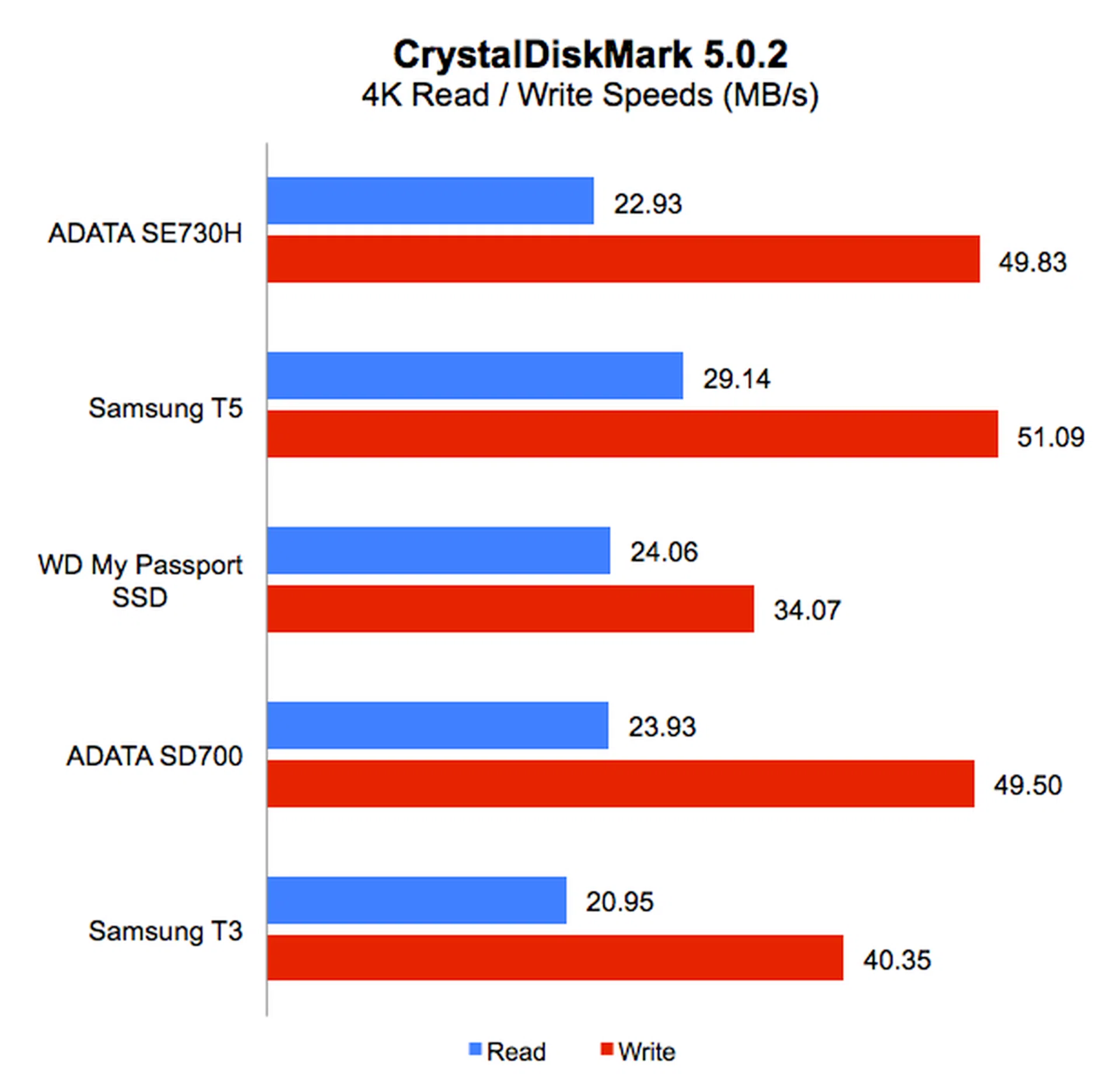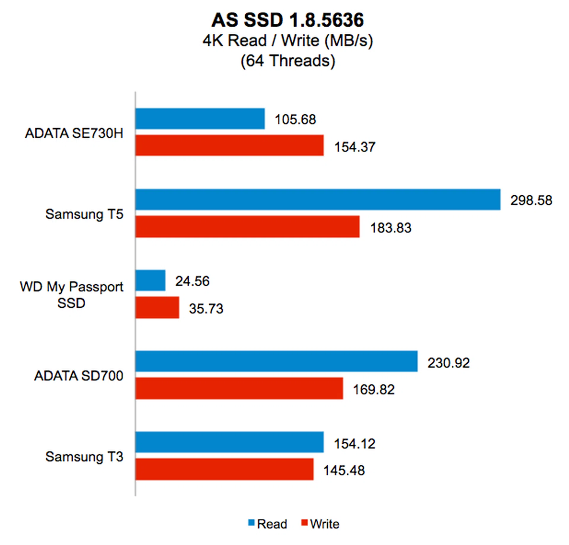 When it came to smaller 4K data blocks, the Samsung Portable SSD T5 pulled ahead with the highest read and write speeds. The ADATA SE730H was close behind. However, the WD My Passport SSD was significantly slower - its write speeds were significantly slower.